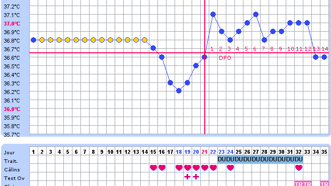 Voici une courbe de température sous Duphaston. On peut constater un léger décalage entre les tests d’ovulation et l’ovulation détectée par la courbe. Autant vous dire que j’étais très déçue à j13 quand j’ai vu la température chuter… ça n’a pas loupé, mes reds ont débarquées 🙁 Site utilisé : www.enceinte.com