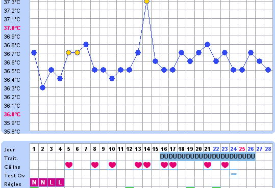 Voici le genre de courbe que je déteste… celle qui te montre que tu n’as pas ovulé ce mois-ci !!! J’étais sous traitement « Duphaston » ce qui m’a donné des règles artificielles car on peut constater que je n’avais pas du tout ovulé… Site utilisé : www.enceinte.com